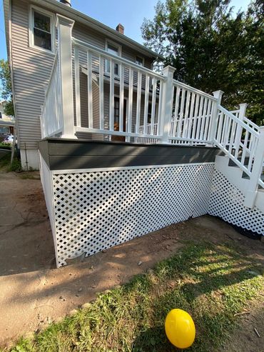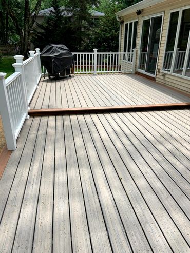 Large 2 level deck with 2 tone composite decking. Customer's suggestion to have the borders in a different color turned out to be amazing.