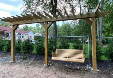 Custom made pergola with pressure treated wood if you like the natural look of wood. We install manufactured pergolas as well.